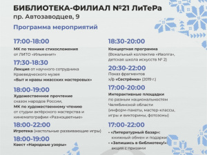 В библиотеке-филиале № 21 "ЛиТеРа" гостей ждут мастер-класс по технике стихосложения от поэтов ЛитО "Ильменит", интерактивные библиотечные площадки, лекция научного сотрудника Краеведческого музея "Быт и нравы миасских мастеровых", художественное прочтение сказок народов России и мастер-класс по художественному чтению от руководителей студии актерского мастерства и кинематографии "Разноцветные", квест "Народные узоры", выступление учащихся детской школы искусств № 2 и вокального коллектива "Иволга", кинопоказ и много другое.